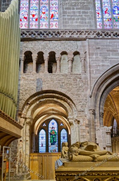 Apparently, this arch is a Norman arch. From my researches this style comes from the Mediterranean area (some of which which the Normans also conquered) where there were influences from Islamic culture. The Gothic arch next to it is where the building was extended and changed over the course of centuries.