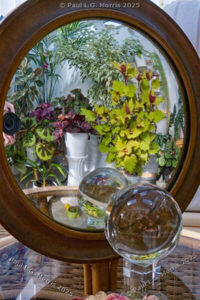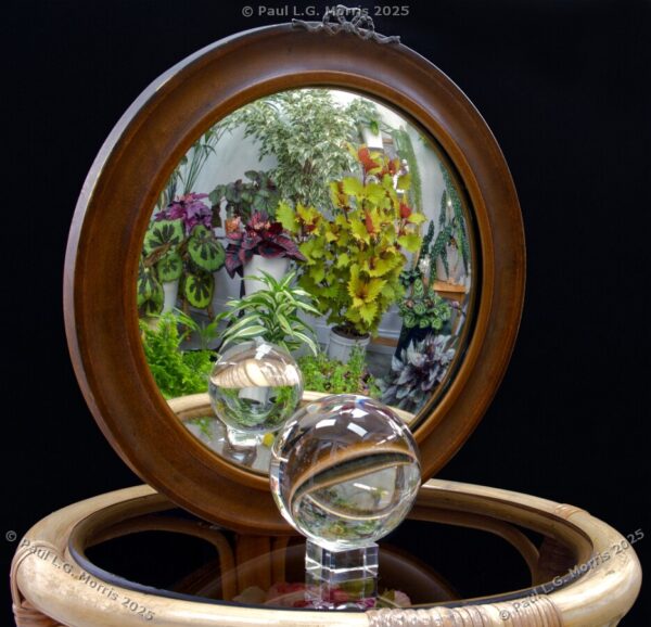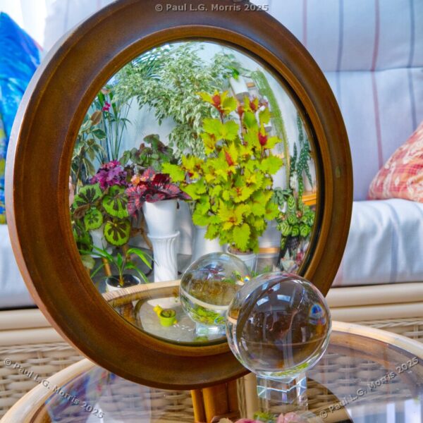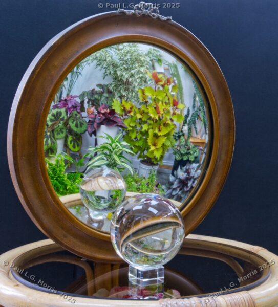 I often like to try out different ways of taking photographs to get something a bit different. Below I show some examples, taken in our small conservatory so as to show some houseplants, using a crystal ball next to a convex mirror: