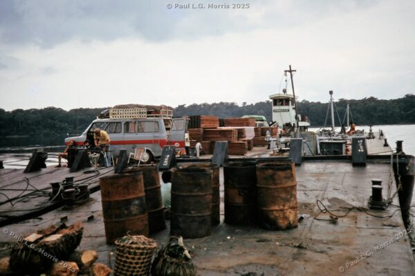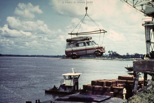 This covered the period 16th June 1975 to 25th June 1975. Obviously we had to pay for the trip then get the vehicles onto the barges. This photo shows the transit being loaded but I wish I had a a photo of the Land Rover being loaded – it was so rear heavy that it leaned backwards at an alarming angle: