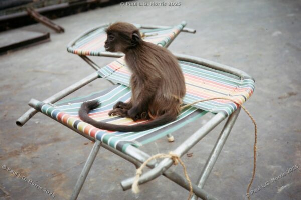 From a canoe that came to the barge, we were offered some bush meat of monkey which we declined. But there was a baby monkey clinging to its dead mother which Lynda decided to rescue. Unfortunately it didn’t live for many more days:
