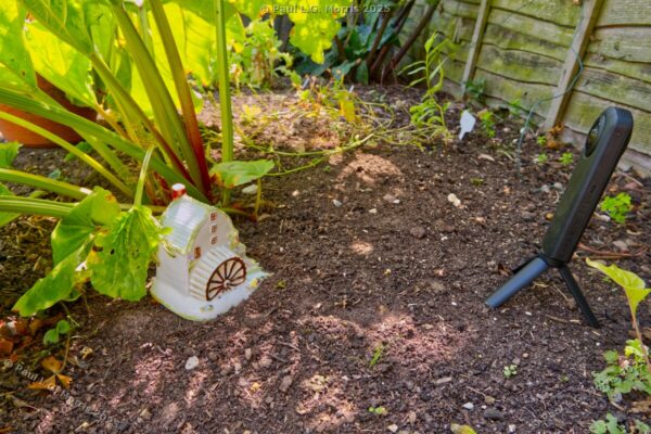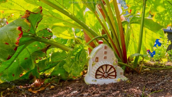 360º close-up view of the miniature cottage under rhubarb leavesThis shows the scene and camera used for the above photoA close-up using a standard camera and lens