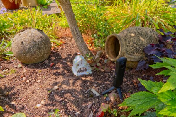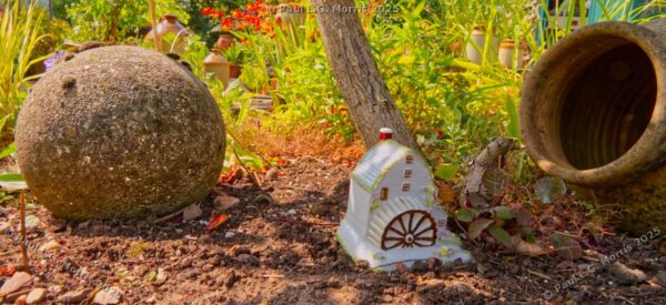 360º close-up view of the miniature cottage under a small tree by shrubs and garden ornamentsThis shows the second scene and camera used for the above photoA close-up of the second scene using a standard camera and lens