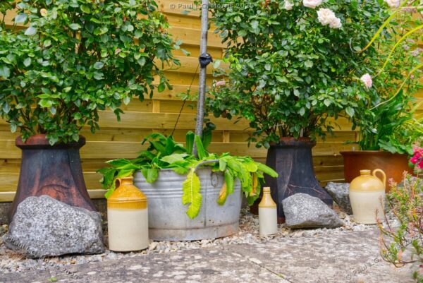 2 roses planted in chimney pots with some rocks and stone jars all by the back fence