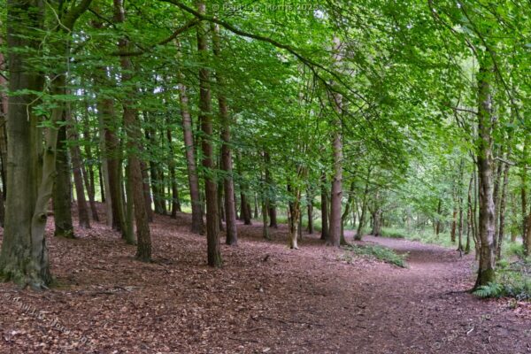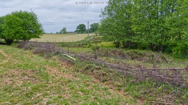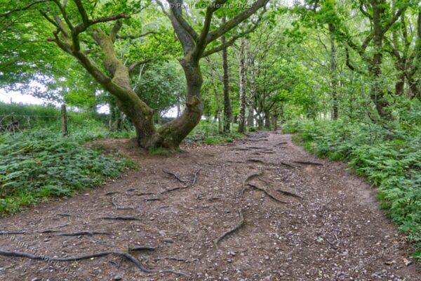 A woodland path at Downs Bank with exposed tree roots creating trip hazardsA panoramic view across the farmland adjacent to Downs BankA long ‘dead hedge’ at Downs Bank – these are getting quite common at many places we visitAnother woodland path at Downs Bank – I think this is quite an atmospheric view showing the accessibility and quite beauty of the place