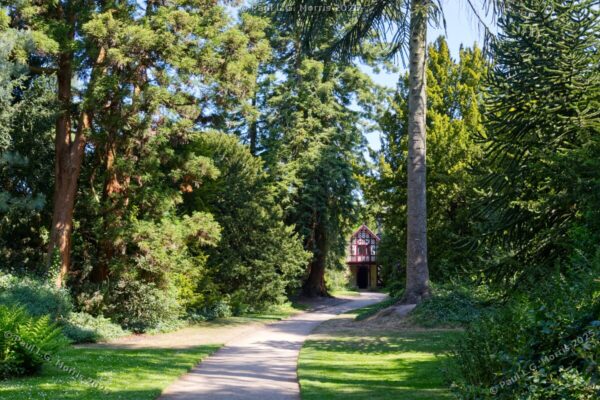 A view of the Grange from the long path of Wellingtonia AvenueLovely pink tulips in the gardenA view of the Cheshire Cottage from the path through the PinetumThe Chinese-style bridge over the pond by the Temple