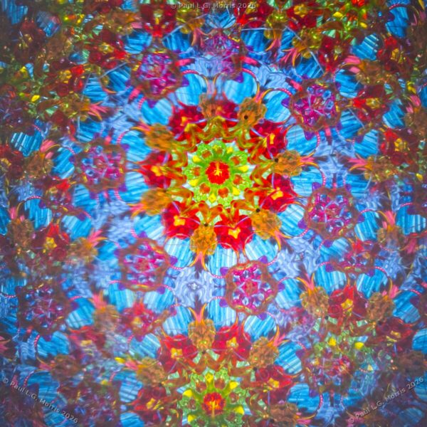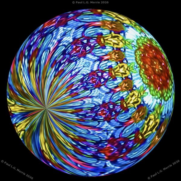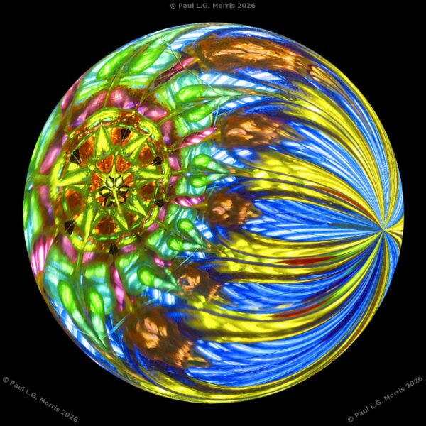 I have been taking photos through a kaleidoscope but wanted to show them in a different manner. I decided on using ball-like projections, some of which looked quite interesting. What do you think?