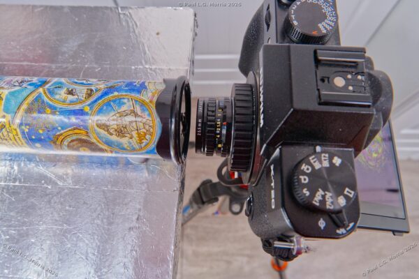The following 2 photos show the setup for taking the middle 2 image pairs using the vintage lenses from the Pentax 110 system (110 Instamatic cartridges). As you can see, these are taken very close up – a close-up filter on the front of the lens helped a lot: